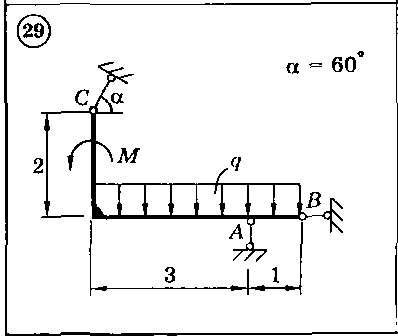 Для представленных на схемах 1-30 тел определить реакции опор. Приведенные на схемах нагрузки имеют следующие величины: вес груза G = 10 кН, сила F = 10 кН, момент пары сил М = 20 кН*м, интенсивность распределенной силы q = 5 кН/м, а также gmax = 5 кН/м. Размеры указаны в метрах. Весом тела следует пренебречь..