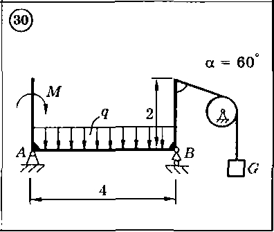 Для представленных на схемах 1-30 тел определить реакции опор. Приведенные на схемах нагрузки имеют следующие величины: вес груза G = 10 кН, сила F = 10 кН, момент пары сил М = 20 кН*м, интенсивность распределенной силы q = 5 кН/м, а также gmax = 5 кН/м. Размеры указаны в метрах. Весом тела следует пренебречь..