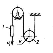 Скорость груза 1 v = 0,5 м/с. Определить угловую скорость подвижного блока 2, если его радиус R = 0,1 м. (Ответ 2,5)
