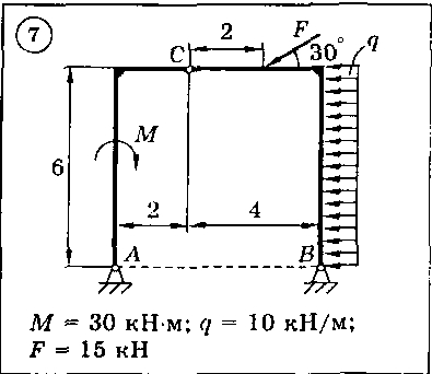 Для представленных на схемах 1-30 составных конструкций найти реакции опор. Размеры указаны в метрах. Весом элементов конструкций пренебречь.