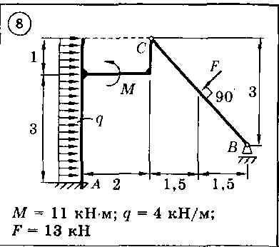 Для представленных на схемах 1-30 составных конструкций найти реакции опор. Размеры указаны в метрах. Весом элементов конструкций пренебречь.