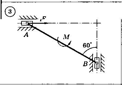 Для представленных на схемах 1-30 механизмов, расположенных в вертикальной плоскости, определить значения силы F из условия равновесия механизмов. Механизм состоит из однородного тонкого стержня АВ длиной L = 4м весом G = 15 кН и двух невесомых ползунов А и В, которые могут перемещаться по направляющим. На стержень действует пара сил с моментом М = 20 кН*м. Трение у ползуна В отсутствует, коэфициент трения ползуна А по направляющий f = 0,4. Размерами ползунов пренебречь.