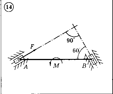 Для представленных на схемах 1-30 механизмов, расположенных в вертикальной плоскости, определить значения силы F из условия равновесия механизмов. Механизм состоит из однородного тонкого стержня АВ длиной L = 4м весом G = 15 кН и двух невесомых ползунов А и В, которые могут перемещаться по направляющим. На стержень действует пара сил с моментом М = 20 кН*м. Трение у ползуна В отсутствует, коэффициент трения ползуна А по направляющий f = 0,4. Размерами ползунов пренебречь.