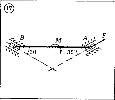 Для представленных на схемах 1-30 механизмов, расположенных в вертикальной плоскости, определить значения силы F из условия равновесия механизмов. Механизм состоит из однородного тонкого стержня АВ длиной L = 4м весом G = 15 кН и двух невесомых ползунов А и В, которые могут перемещаться по направляющим. На стержень действует пара сил с моментом М = 20 кН*м. Трение у ползуна В отсутствует, коэффициент трения ползуна А по направляющий f = 0,4. Размерами ползунов пренебречь.