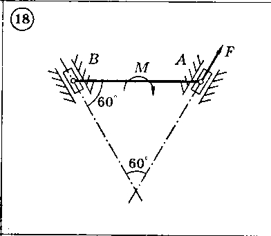 Для представленных на схемах 1-30 механизмов, расположенных в вертикальной плоскости, определить значения силы F из условия равновесия механизмов. Механизм состоит из однородного тонкого стержня АВ длиной L = 4м весом G = 15 кН и двух невесомых ползунов А и В, которые могут перемещаться по направляющим. На стержень действует пара сил с моментом М = 20 кН*м. Трение у ползуна В отсутствует, коэффициент трения ползуна А по направляющий f = 0,4. Размерами ползунов пренебречь.