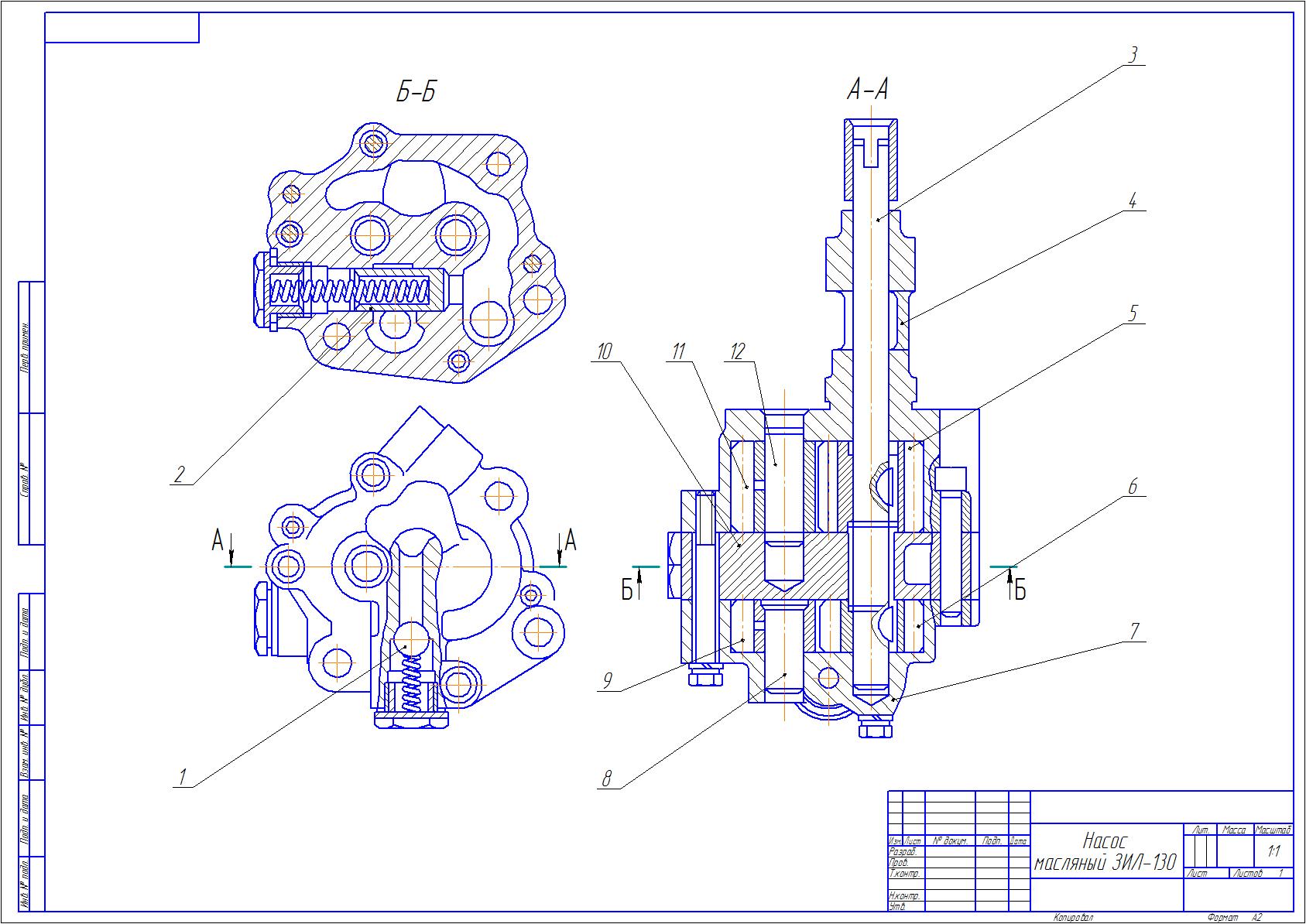 Чертеж насос масляный ЗИЛ-130. Сборочный чертеж + спецификация