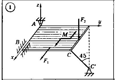 Для представленных на схемах 1-30 тел определить реакции опор. Тело представляет собой однородную прямоугольную плиту весом G = 12 кН, имеющую размеры |АВ| = 6 м и |ВС| = 2 м. Плита закреплена с помощью трех опор: шарнирно-неподвижной опоры (сферический шарнир) в точке А, подшибниковой опоры в точке В и опорного стержня в точке С. На плиту действует: пара сил с моментом М = 10 кН*м, и в серединах соответствующих сторон - горизонтальная сила F1 = 6 кН и вертикальная сила F2 = 8 кН.