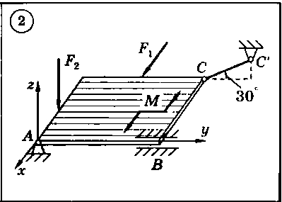 Для представленных на схемах 1-30 тел определить реакции опор. Тело представляет собой однородную прямоугольную плиту весом G = 12 кН, имеющую размеры |АВ| = 6 м и |ВС| = 2 м. Плита закреплена с помощью трех опор: шарнирно-неподвижной опоры (сферический шарнир) в точке А, подшибниковой опоры в точке В и опорного стержня в точке С. На плиту действует: пара сил с моментом М = 10 кН*м, и в серединах соответствующих сторон - горизонтальная сила F1 = 6 кН и вертикальная сила F2 = 8 кН.