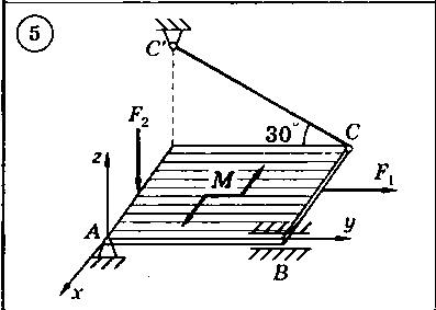 Для представленных на схемах 1-30 тел определить реакции опор. Тело представляет собой однородную прямоугольную плиту весом G = 12 кН, имеющую размеры |АВ| = 6 м и |ВС| = 2 м. Плита закреплена с помощью трех опор: шарнирно-неподвижной опоры (сферический шарнир) в точке А, подшибниковой опоры в точке В и опорного стержня в точке С. На плиту действует: пара сил с моментом М = 10 кН*м, и в серединах соответствующих сторон - горизонтальная сила F1 = 6 кН и вертикальная сила F2 = 8 кН.