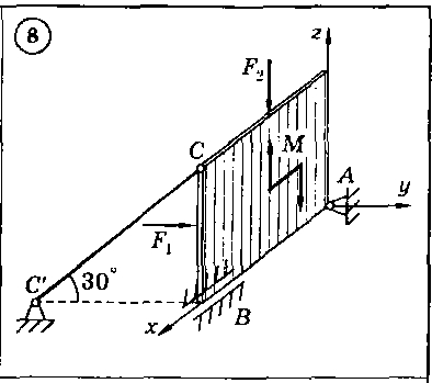 Для представленных на схемах 1-30 тел определить реакции опор. Тело представляет собой однородную прямоугольную плиту весом G = 12 кН, имеющую размеры |АВ| = 6 м и |ВС| = 2 м. Плита закреплена с помощью трех опор: шарнирно-неподвижной опоры (сферический шарнир) в точке А, подшибниковой опоры в точке В и опорного стержня в точке С. На плиту действует: пара сил с моментом М = 10 кН*м, и в серединах соответствующих сторон - горизонтальная сила F1 = 6 кН и вертикальная сила F2 = 8 кН.