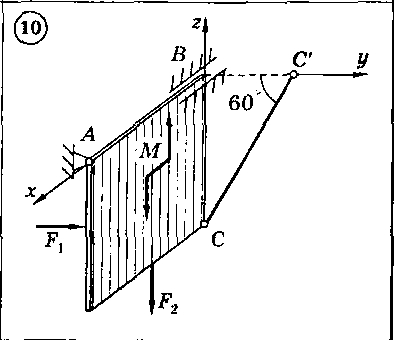 Для представленных на схемах 1-30 тел определить реакции опор. Тело представляет собой однородную прямоугольную плиту весом G = 12 кН, имеющую размеры |АВ| = 6 м и |ВС| = 2 м. Плита закреплена с помощью трех опор: шарнирно-неподвижной опоры (сферический шарнир) в точке А, подшибниковой опоры в точке В и опорного стержня в точке С. На плиту действует: пара сил с моментом М = 10 кН*м, и в серединах соответствующих сторон - горизонтальная сила F1 = 6 кН и вертикальная сила F2 = 8 кН.