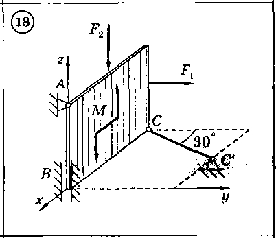 Для представленных на схемах 1-30 тел определить реакции опор. Тело представляет собой однородную прямоугольную плиту весом G = 12 кН, имеющую размеры |АВ| = 6 м и |ВС| = 2 м. Плита закреплена с помощью трех опор: шарнирно-неподвижной опоры (сферический шарнир) в точке А, подшибниковой опоры в точке В и опорного стержня в точке С. На плиту действует: пара сил с моментом М = 10 кН*м, и в серединах соответствующих сторон - горизонтальная сила F1 = 6 кН и вертикальная сила F2 = 8 кН.