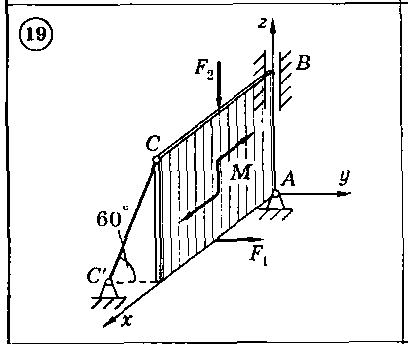Для представленных на схемах 1-30 тел определить реакции опор. Тело представляет собой однородную прямоугольную плиту весом G = 12 кН, имеющую размеры |АВ| = 6 м и |ВС| = 2 м. Плита закреплена с помощью трех опор: шарнирно-неподвижной опоры (сферический шарнир) в точке А, подшибниковой опоры в точке В и опорного стержня в точке С. На плиту действует: пара сил с моментом М = 10 кН*м, и в серединах соответствующих сторон - горизонтальная сила F1 = 6 кН и вертикальная сила F2 = 8 кН.
