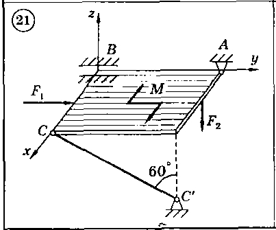 Для представленных на схемах 1-30 тел определить реакции опор. Тело представляет собой однородную прямоугольную плиту весом G = 12 кН, имеющую размеры |АВ| = 6 м и |ВС| = 2 м. Плита закреплена с помощью трех опор: шарнирно-неподвижной опоры (сферический шарнир) в точке А, подшибниковой опоры в точке В и опорного стержня в точке С. На плиту действует: пара сил с моментом М = 10 кН*м, и в серединах соответствующих сторон - горизонтальная сила F1 = 6 кН и вертикальная сила F2 = 8 кН.