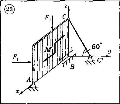 Для представленных на схемах 1-30 тел определить реакции опор. Тело представляет собой однородную прямоугольную плиту весом G = 12 кН, имеющую размеры |АВ| = 6 м и |ВС| = 2 м. Плита закреплена с помощью трех опор: шарнирно-неподвижной опоры (сферический шарнир) в точке А, подшибниковой опоры в точке В и опорного стержня в точке С. На плиту действует: пара сил с моментом М = 10 кН*м, и в серединах соответствующих сторон - горизонтальная сила F1 = 6 кН и вертикальная сила F2 = 8 кН.