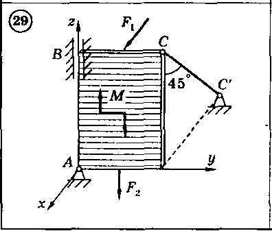 Для представленных на схемах 1-30 тел определить реакции опор. Тело представляет собой однородную прямоугольную плиту весом G = 12 кН, имеющую размеры |АВ| = 6 м и |ВС| = 2 м. Плита закреплена с помощью трех опор: шарнирно-неподвижной опоры (сферический шарнир) в точке А, подшибниковой опоры в точке В и опорного стержня в точке С. На плиту действует: пара сил с моментом М = 10 кН*м, и в серединах соответствующих сторон - горизонтальная сила F1 = 6 кН и вертикальная сила F2 = 8 кН.