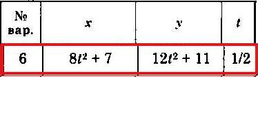 В соответствии с заданными уравнениями движения (варианты 1 - 30) определить траекторию движения точки. Для заданного момента времени t найти положение точки на траектории, ее скорость и ускорение (показать их на рисунке), а также радиус кривизны траектории в соответствующей точке. Данные, необходимые для вычисления, представлены ниже. Координаты х и у даны в метрах, время в секундах.