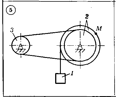Для приведенных ниже схем механизмов 1-30 по известным характеристикам движения груза 1 — скорости V1x и ускорению а1х, или по заданному уравнению движения тела 1 — x(t), или по заданному уравнению движения вала 3 — Ф3(t) определить и показать на рисунке скорость и ускорение точки М, а также скорость и ускорение груза 1 в данный момент времени. Исходные данные, включая радиусы шестерен, шкивов и барабанов, приведены в таблице.