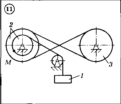 Для приведенных ниже схем механизмов 1-30 по известным характеристикам движения груза 1 — скорости V1x и ускорению а1х, или по заданному уравнению движения тела 1 — x(t), или по заданному уравнению движения вала 3 — Ф3(t) определить и показать на рисунке скорость и ускорение точки М, а также скорость и ускорение груза 1 в данный момент времени. Исходные данные, включая радиусы шестерен, шкивов и барабанов, приведены в таблице.