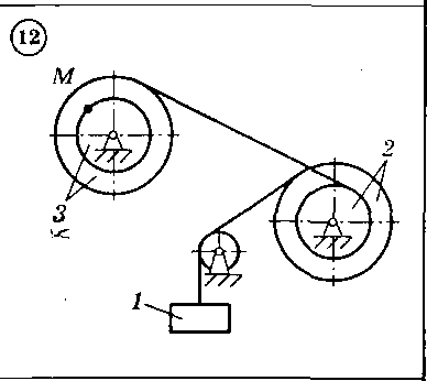 Для приведенных ниже схем механизмов 1-30 по известным характеристикам движения груза 1 — скорости V1x и ускорению а1х, или по заданному уравнению движения тела 1 — x(t), или по заданному уравнению движения вала 3 — Ф3(t) определить и показать на рисунке скорость и ускорение точки М, а также скорость и ускорение груза 1 в данный момент времени. Исходные данные, включая радиусы шестерен, шкивов и барабанов, приведены в таблице.