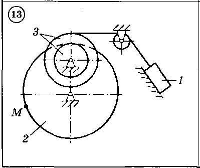 Для приведенных ниже схем механизмов 1-30 по известным характеристикам движения груза 1 — скорости V1x и ускорению а1х, или по заданному уравнению движения тела 1 — x(t), или по заданному уравнению движения вала 3 — Ф3(t) определить и показать на рисунке скорость и ускорение точки М, а также скорость и ускорение груза 1 в данный момент времени. Исходные данные, включая радиусы шестерен, шкивов и барабанов, приведены в таблице.