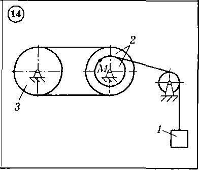 Для приведенных ниже схем механизмов 1-30 по известным характеристикам движения груза 1 — скорости V1x и ускорению а1х, или по заданному уравнению движения тела 1 — x(t), или по заданному уравнению движения вала 3 — Ф3(t) определить и показать на рисунке скорость и ускорение точки М, а также скорость и ускорение груза 1 в данный момент времени. Исходные данные, включая радиусы шестерен, шкивов и барабанов, приведены в таблице.