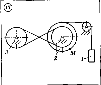 Для приведенных ниже схем механизмов 1-30 по известным характеристикам движения груза 1 — скорости V1x и ускорению а1х, или по заданному уравнению движения тела 1 — x(t), или по заданному уравнению движения вала 3 — Ф3(t) определить и показать на рисунке скорость и ускорение точки М, а также скорость и ускорение груза 1 в данный момент времени. Исходные данные, включая радиусы шестерен, шкивов и барабанов, приведены в таблице.