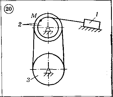 Для приведенных ниже схем механизмов 1-30 по известным характеристикам движения груза 1 — скорости V1x и ускорению а1х, или по заданному уравнению движения тела 1 — x(t), или по заданному уравнению движения вала 3 — Ф3(t) определить и показать на рисунке скорость и ускорение точки М, а также скорость и ускорение груза 1 в данный момент времени. Исходные данные, включая радиусы шестерен, шкивов и барабанов, приведены в таблице.