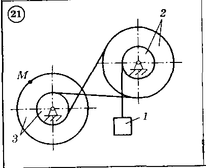 Для приведенных ниже схем механизмов 1-30 по известным характеристикам движения груза 1 — скорости V1x и ускорению а1х, или по заданному уравнению движения тела 1 — x(t), или по заданному уравнению движения вала 3 — Ф3(t) определить и показать на рисунке скорость и ускорение точки М, а также скорость и ускорение груза 1 в данный момент времени. Исходные данные, включая радиусы шестерен, шкивов и барабанов, приведены в таблице.
