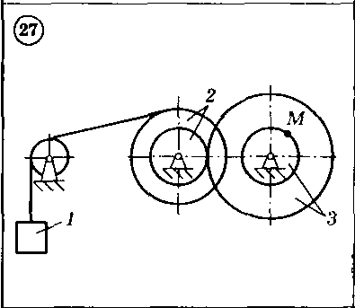 Для приведенных ниже схем механизмов 1-30 по известным характеристикам движения груза 1 — скорости V1x и ускорению а1х, или по заданному уравнению движения тела 1 — x(t), или по заданному уравнению движения вала 3 — Ф3(t) определить и показать на рисунке скорость и ускорение точки М, а также скорость и ускорение груза 1 в данный момент времени. Исходные данные, включая радиусы шестерен, шкивов и барабанов, приведены в таблице.