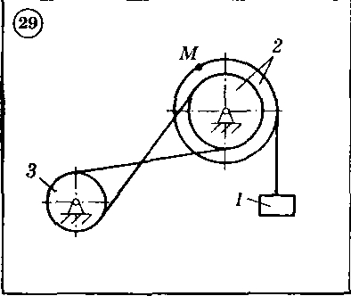 Для приведенных ниже схем механизмов 1-30 по известным характеристикам движения груза 1 — скорости V1x и ускорению а1х, или по заданному уравнению движения тела 1 — x(t), или по заданному уравнению движения вала 3 — Ф3(t) определить и показать на рисунке скорость и ускорение точки М, а также скорость и ускорение груза 1 в данный момент времени. Исходные данные, включая радиусы шестерен, шкивов и барабанов, приведены в таблице.