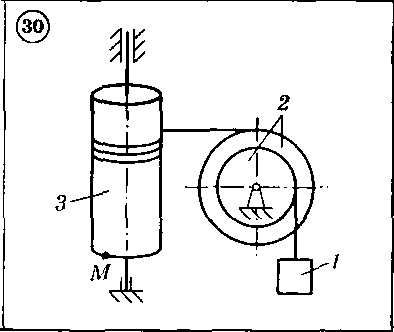 Для приведенных ниже схем механизмов 1-30 по известным характеристикам движения груза 1 — скорости V1x и ускорению а1х, или по заданному уравнению движения тела 1 — x(t), или по заданному уравнению движения вала 3 — Ф3(t) определить и показать на рисунке скорость и ускорение точки М, а также скорость и ускорение груза 1 в данный момент времени. Исходные данные, включая радиусы шестерен, шкивов и барабанов, приведены в таблице.