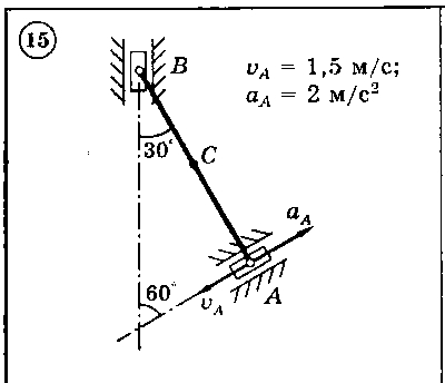 Для представленных на схемах 1-30 механизмов, состоящих из шатуна АВ длиной 2 м и двух ползунов, по заданным величинам скорости и ускорения ползуна А определить скорость и ускорение ползуна В и средней точки С шатуна, а также угловую скорость и угловое ускорение шатуна.
