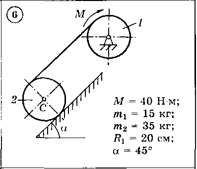 Для приведенных на схемах 1-30 механических систем, используя теорему об изменении кинетической энергии в интегральной форме, определить угловую скорость (варианты 4, 6, 7, 9, 11, 18, 25, 26, 28) или линейную скорость (остальные варианты) тела 1 после его заданного перемещения Фи1 = 2пи рад или S1 = 2 м. Движение начинается из состояния покоя.