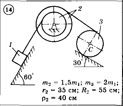 Для приведенных на схемах 1-30 механических систем, используя теорему об изменении кинетической энергии в дифференциальной форме, определить угловое ускорение (варианты 4, 6, 7, 9, 11, 18, 25, 26, 28) или линейное ускорение (остальные варианты) тела 1. Нити невесомы и нерастяжимы. Принятые обозначения: т — массы тел, R и r — радиусы, р — радиус инерции (если он не указан, тело считать однородным цилиндром); при наличии трения указываются f — коэффициент трения скольжения, fк — коэффициент трения качения.