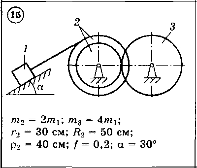 Для приведенных на схемах 1-30 механических систем, используя теорему об изменении кинетической энергии в дифференциальной форме, определить угловое ускорение (варианты 4, 6, 7, 9, 11, 18, 25, 26, 28) или линейное ускорение (остальные варианты) тела 1. Нити невесомы и нерастяжимы. Принятые обозначения: т — массы тел, R и r — радиусы, р — радиус инерции (если он не указан, тело считать однородным цилиндром); при наличии трения указываются f — коэффициент трения скольжения, fк — коэффициент трения качения.