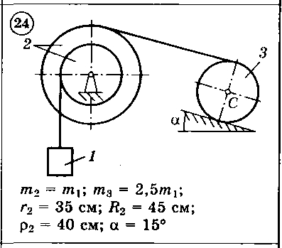 Для приведенных на схемах 1-30 механических систем, используя теорему об изменении кинетической энергии в дифференциальной форме, определить угловое ускорение (варианты 4, 6, 7, 9, 11, 18, 25, 26, 28) или линейное ускорение (остальные варианты) тела 1. Нити невесомы и нерастяжимы. Принятые обозначения: т — массы тел, R и r — радиусы, р — радиус инерции (если он не указан, тело считать однородным цилиндром); при наличии трения указываются f — коэффициент трения скольжения, fк — коэффициент трения качения.