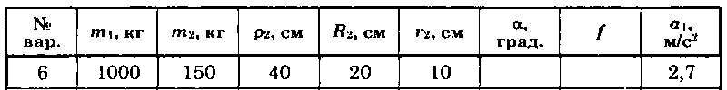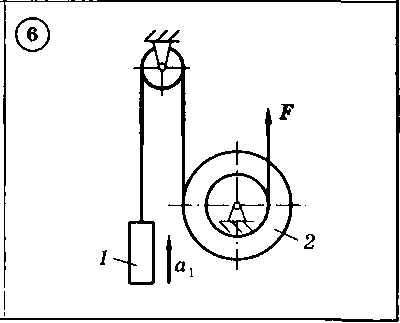 Для приведенных на схемах 1-30 механических систем, используя принцип Даламбера, определить величину силы F,необходимую для перемещения груза с заданным ускорением а1, а также усилие в грузовом тросе. Исходные данные: массы груза т1 и барабана т2, радиус барабана R2 (у двойного барабана имеется также r2), его радиус инерции р2 (если он не указан, тело считать однородным цилиндром), угол а и коэффициент трения скольжения f приведены в таблице. Непронумерованные блоки и катки считать невесомыми. Трением на осях барабана и блоков пренебречь.