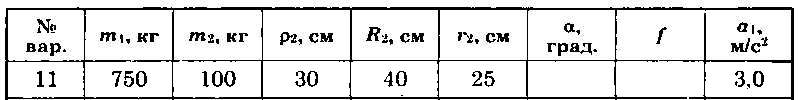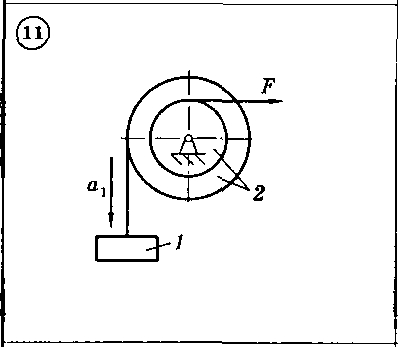 Для приведенных на схемах 1-30 механических систем, используя принцип Даламбера, определить величину силы F,необходимую для перемещения груза с заданным ускорением а1, а также усилие в грузовом тросе. Исходные данные: массы груза т1 и барабана т2, радиус барабана R2 (у двойного барабана имеется также r2), его радиус инерции р2 (если он не указан, тело считать однородным цилиндром), угол а и коэффициент трения скольжения f приведены в таблице. Непронумерованные блоки и катки считать невесомыми. Трением на осях барабана и блоков пренебречь.