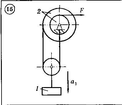 Для приведенных на схемах 1-30 механических систем, используя принцип Даламбера, определить величину силы F,необходимую для перемещения груза с заданным ускорением а1, а также усилие в грузовом тросе. Исходные данные: массы груза т1 и барабана т2, радиус барабана R2 (у двойного барабана имеется также r2), его радиус инерции р2 (если он не указан, тело считать однородным цилиндром), угол а и коэффициент трения скольжения f приведены в таблице. Непронумерованные блоки и катки считать невесомыми. Трением на осях барабана и блоков пренебречь.