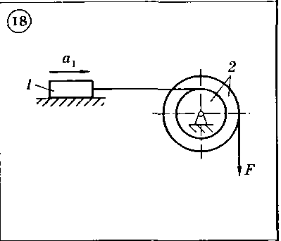 Для приведенных на схемах 1-30 механических систем, используя принцип Даламбера, определить величину силы F,необходимую для перемещения груза с заданным ускорением а1, а также усилие в грузовом тросе. Исходные данные: массы груза т1 и барабана т2, радиус барабана R2 (у двойного барабана имеется также r2), его радиус инерции р2 (если он не указан, тело считать однородным цилиндром), угол а и коэффициент трения скольжения f приведены в таблице. Непронумерованные блоки и катки считать невесомыми. Трением на осях барабана и блоков пренебречь.