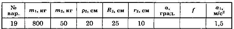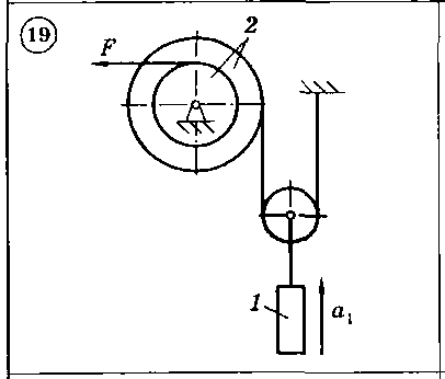 Для приведенных на схемах 1-30 механических систем, используя принцип Даламбера, определить величину силы F,необходимую для перемещения груза с заданным ускорением а1, а также усилие в грузовом тросе. Исходные данные: массы груза т1 и барабана т2, радиус барабана R2 (у двойного барабана имеется также r2), его радиус инерции р2 (если он не указан, тело считать однородным цилиндром), угол а и коэффициент трения скольжения f приведены в таблице. Непронумерованные блоки и катки считать невесомыми. Трением на осях барабана и блоков пренебречь.