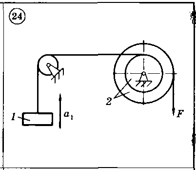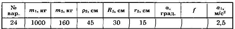 Для приведенных на схемах 1-30 механических систем, используя принцип Даламбера, определить величину силы F,необходимую для перемещения груза с заданным ускорением а1, а также усилие в грузовом тросе. Исходные данные: массы груза т1 и барабана т2, радиус барабана R2 (у двойного барабана имеется также r2), его радиус инерции р2 (если он не указан, тело считать однородным цилиндром), угол а и коэффициент трения скольжения f приведены в таблице. Непронумерованные блоки и катки считать невесомыми. Трением на осях барабана и блоков пренебречь.