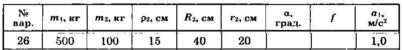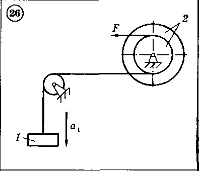 Для приведенных на схемах 1-30 механических систем, используя принцип Даламбера, определить величину силы F,необходимую для перемещения груза с заданным ускорением а1, а также усилие в грузовом тросе. Исходные данные: массы груза т1 и барабана т2, радиус барабана R2 (у двойного барабана имеется также r2), его радиус инерции р2 (если он не указан, тело считать однородным цилиндром), угол а и коэффициент трения скольжения f приведены в таблице. Непронумерованные блоки и катки считать невесомыми. Трением на осях барабана и блоков пренебречь.