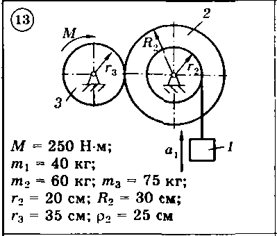 Для приведенных на схемах 1-30 механических систем, используя уравнения Лагранжа второго рода, определить указанное на схеме угловое ускорение или линейное ускорение. Нити невесомы и нерастяжимы. Принятые обозначения: т — массы тел, R и r — радиусы, р — радиус инерции (если он не указан, тело считать однородным цилиндром); при наличии трения указываются: f — коэффициент трения скольжения, fк — коэффициент трения качения.