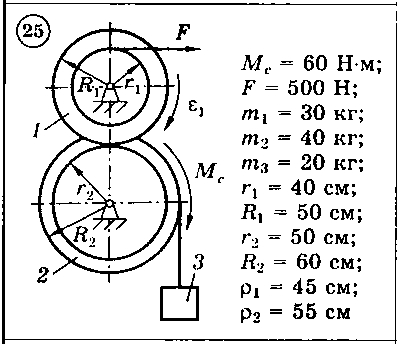 Для приведенных на схемах 1-30 механических систем, используя уравнения Лагранжа второго рода, определить указанное на схеме угловое ускорение или линейное ускорение. Нити невесомы и нерастяжимы. Принятые обозначения: т — массы тел, R и r — радиусы, р — радиус инерции (если он не указан, тело считать однородным цилиндром); при наличии трения указываются: f — коэффициент трения скольжения, fк — коэффициент трения качения.