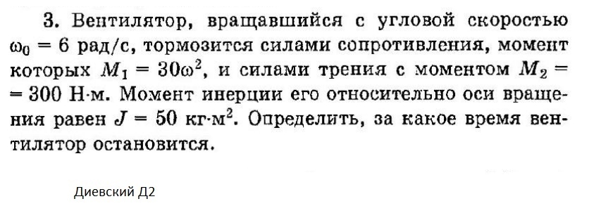 Решение задачи Д2 В3.     Вентилятор, вращавшийся с угловой скоростью w0 = 6 рад/с, тормозится силами сопротивления, момент которых М1 = З0w2, и силами трения с моментом М2 = = 300 Нм. Момент инерции его относительно оси враще­ния равен J = 50 кгм2. Определить, за какое время вен­тилятор остановится.