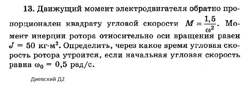 Решение задачи Д2 В13.   Движущий момент электродвигателя обратно пропорционален квадрату угловой скорости М = 1,5/w2. Moмент инерции ротора относительно оси вращения равен J = 50 кгм2. Определить, через какое время угловая ско­рость ротора утроится, если начальная угловая скорость равна w0 = 0,5 рад/с.