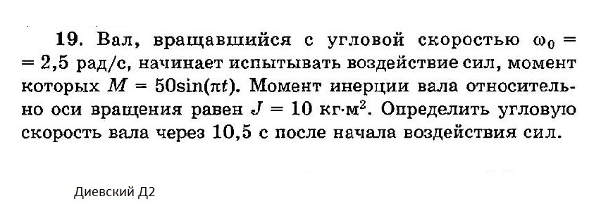 Решение задачи Д2 В19.     Вал, вращавшийся с угловой скоростью w0 = = 2,5 рад/с, начинает испытывать воздействие сил, момент которых М = 50sin(Пи t). Момент инерции вала относитель­но оси вращения равен J = 10 кг-м2. Определить угловую скорость вала через 10,5 с после начала воздействия сил.