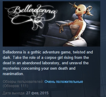 Belladonna — это готическая приключенческая игра, запутанная и мрачная. Возьмите на себя роль девушки-трупа, восстающей из мертвых в заброшенной лаборатории, и разгадайте тайны, касающиеся вашей собственной смерти и реанимации.